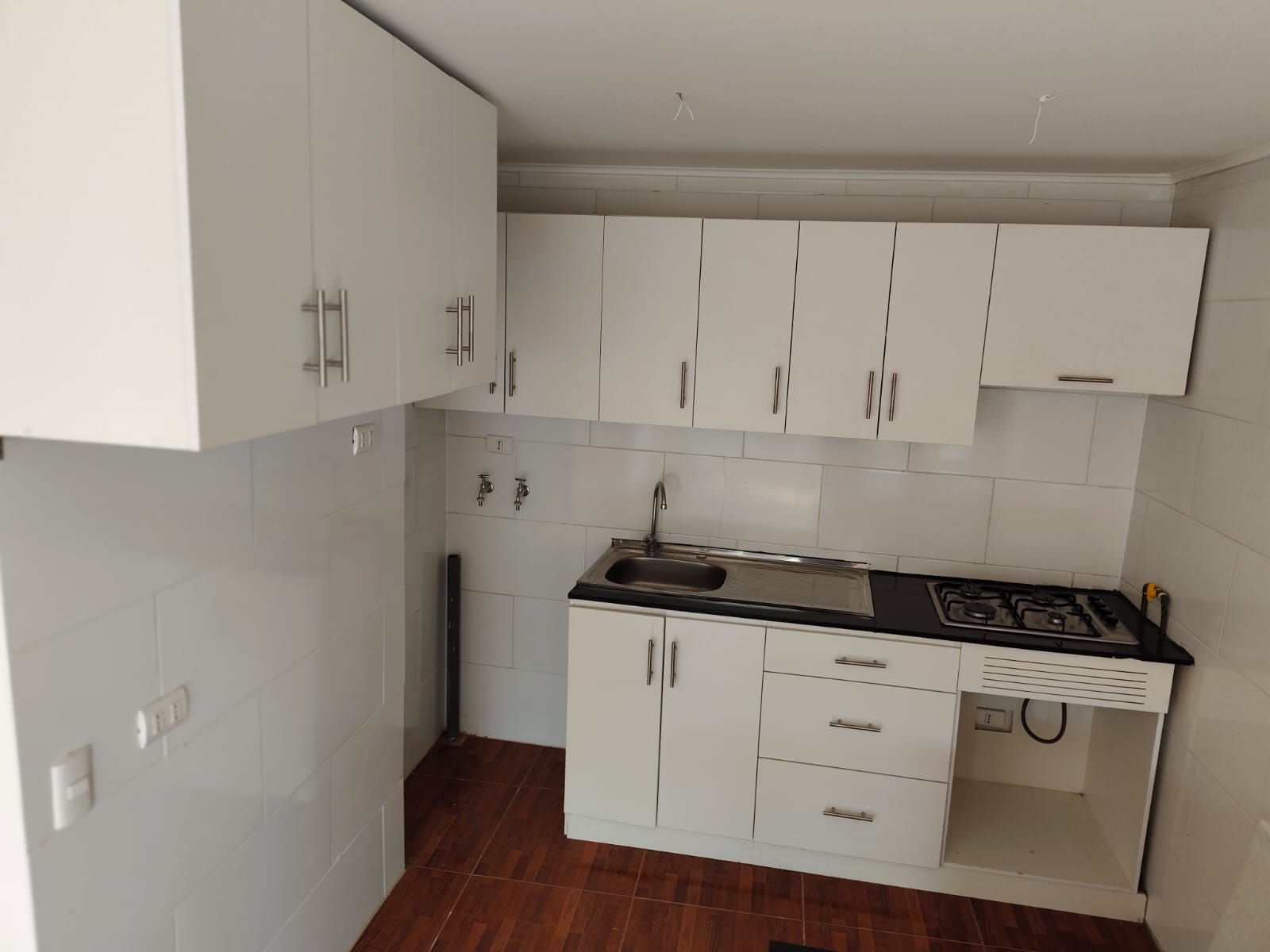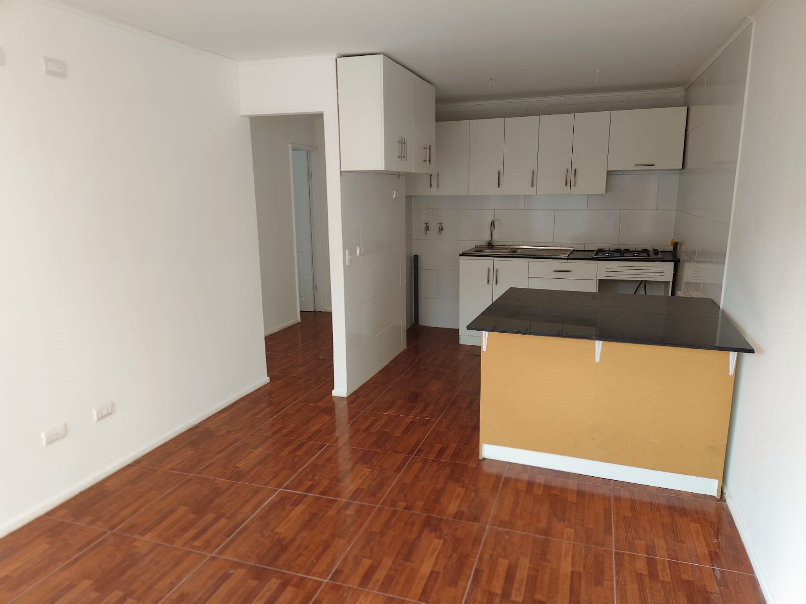 Cocina americana con encimera, living – comedor.